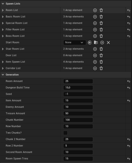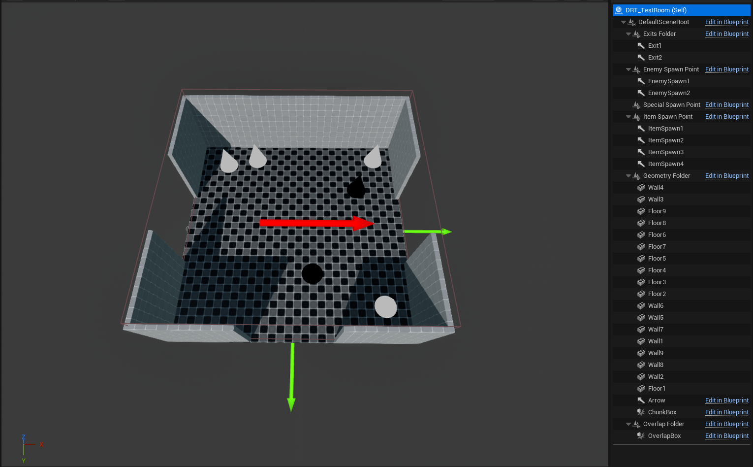 The Master Room held empty folders for Geometry, Exits, Items, and Enemy Spawn Points, which helped organize each room’s components. The BluePrint contained only a Box Collider to detect room overlapping during generation and an Arrow Component for debugging purposes and to show the direction the room would spawn.