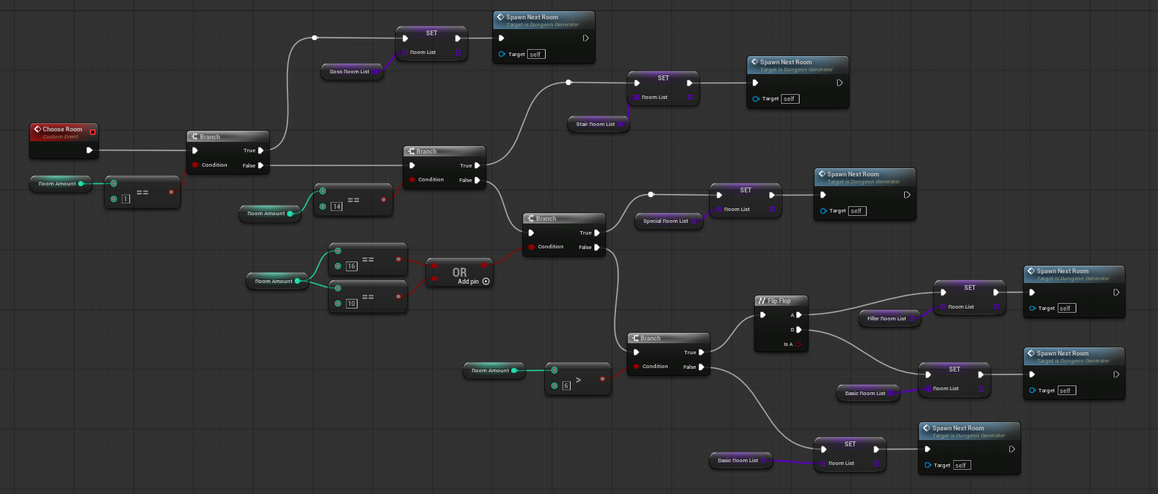 I tried several diffrent ways to get the rooms to spawn in the chunks correctly. The best solution I found this far was to check if a room overlapped with a chunk, if they did a boolen node called “Chunk Check” would turn to true. This would allow the room to stay and the script would continue, it would also turn back Chunk Check to false to test the next room that would generate.
